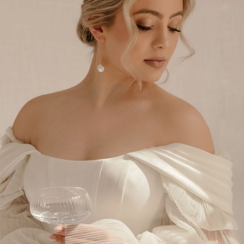 We recommend pairing them with a high-neck or off-the-shoulder dress and a classic updo hairstyle.