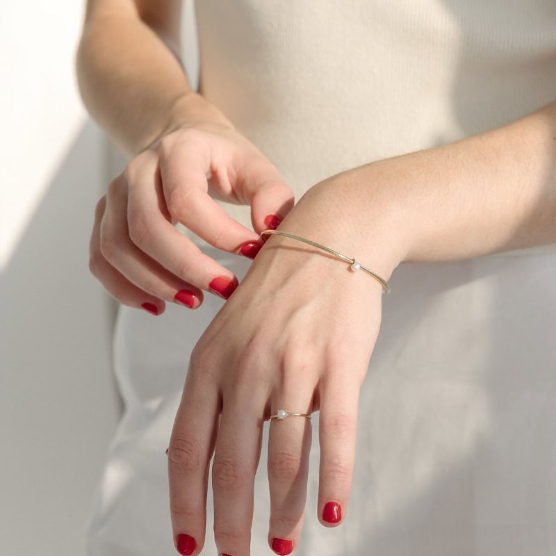 Our Dainty Pearl Bangle features a small 4mm freshwater pearl charm that slides effortlessly along a fine 1.8mm solid gold or sterling silver band.