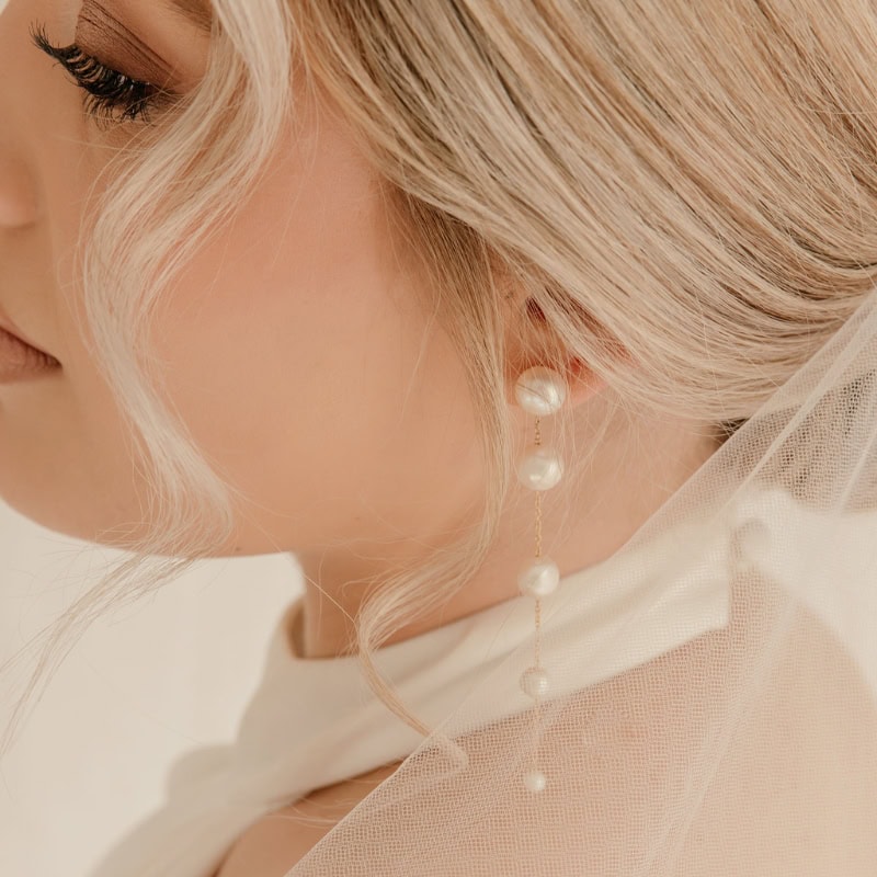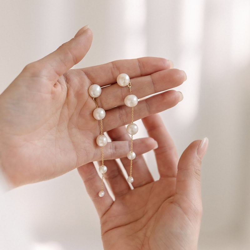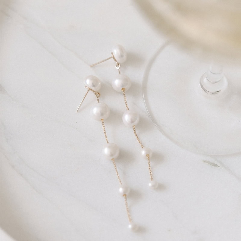 Designed for the captivating bride, the Fading Pearl Drop Earrings feature a string of pearls that transition from large to small, creating a beautiful fading effect. The design follows classic principles of balance and rhythm, with the graduated pearls forming a flow that draws the eye downward. Their elegant movement and timeless design will definitely leave a lasting impression as you walk down the aisle!