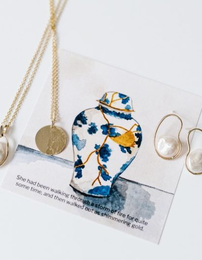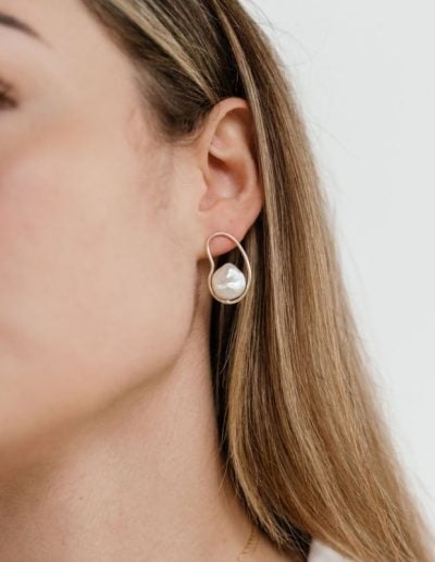 The golden oval-shaped earrings with the baroque pearl in the middle represent God’s hand of preservation over His children on Earth. Like each baroque pearl, which is not perfect but unique, it represents God’s children, each different but so unique. The pearl is surrounded by pure gold and securely held, just as God holds His children on Earth in His saving right hand.