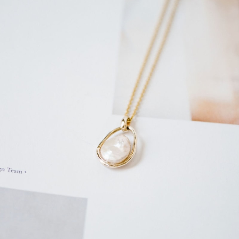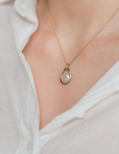 The golden oval-shaped pendant with the baroque pearl in the middle represents God’s hand of preservation over His children on Earth. Like each baroque pearl, which is not perfect but unique, it represents God’s children, each different but so unique. The pearl is surrounded by pure gold and securely held, just as God holds His children on Earth in His saving right hand.