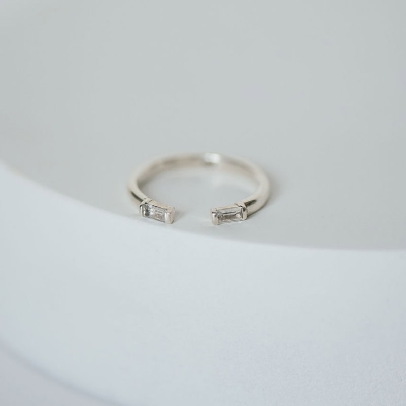 The Leap of Faith Ring features an open 2.2mm band set with two 2×4mm baguette-cut moissanites on each side. The open space represents that moment of trust between what was and what’s still to come – a quiet reminder to have faith in your journey.