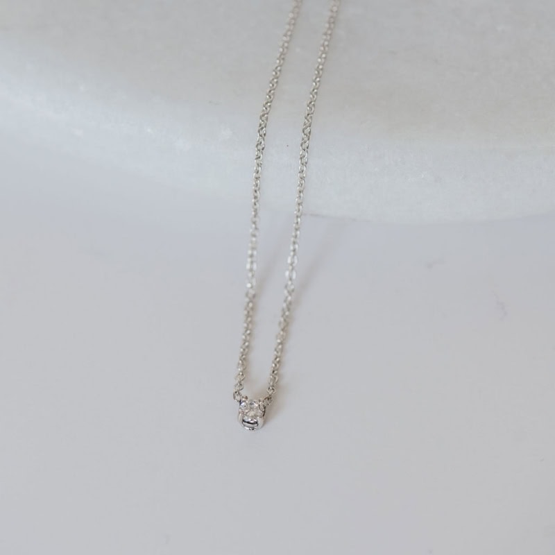 The Milestone Necklace features a 3 mm diamond or moissanite set in a classic four-claw collet, soldered to a dainty chain. This Necklace is minimal and refined, made to honour life’s defining moments with understated elegance.