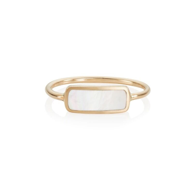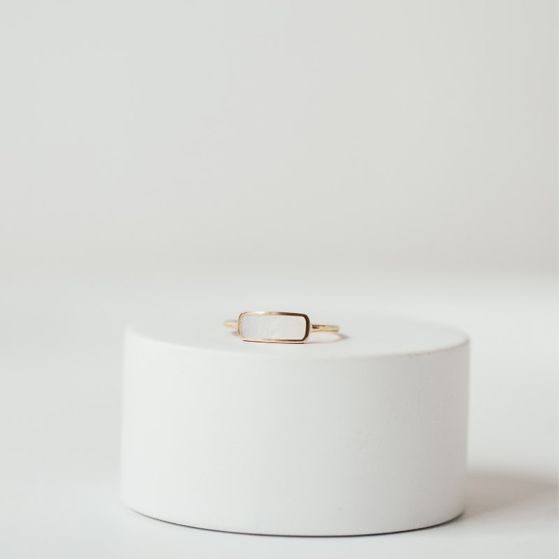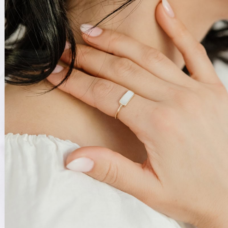 The architectural lines of the Mother-of-Pearl Arch Ring, hand-crafted in sterling silver or 9k gold, make this piece a sophisticated choice for those who appreciate refined, minimalist design.