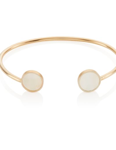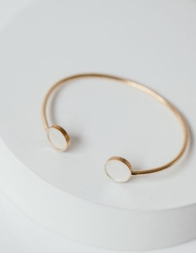 This Mother-of-Pearl Circular Bangle, with two polished mother-of-pearl circles framed in sterling silver or 9k gold, brings a subtle elegance, pairing effortlessly with our matching studs and necklace.