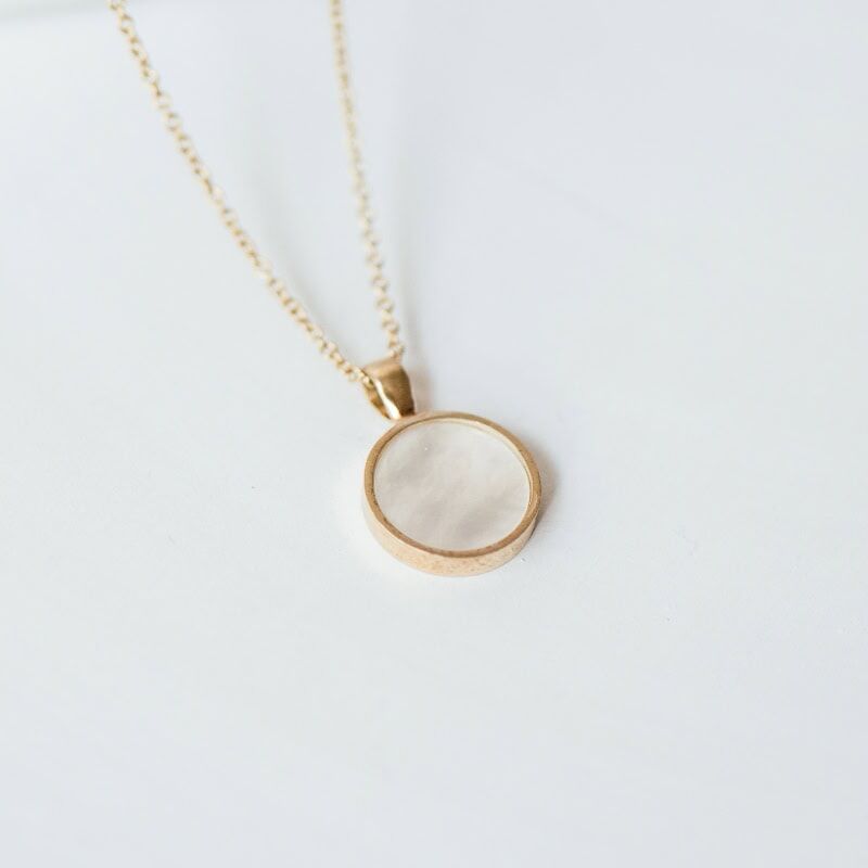 The Mother-of-Pearl Circular Necklace offers understated elegance, with a round pendant set in sterling silver or 9k gold. A timeless piece for those who appreciate the beauty of simplicity.