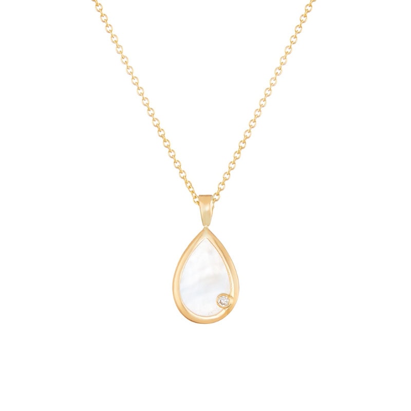 This Mother-of-Pearl Drop Necklace echoes timeless elegance. The teardrop pendant, framed in sterling silver or 9k gold and topped with a 2mm diamond, is a refined choice for those who live for luxury and detail.