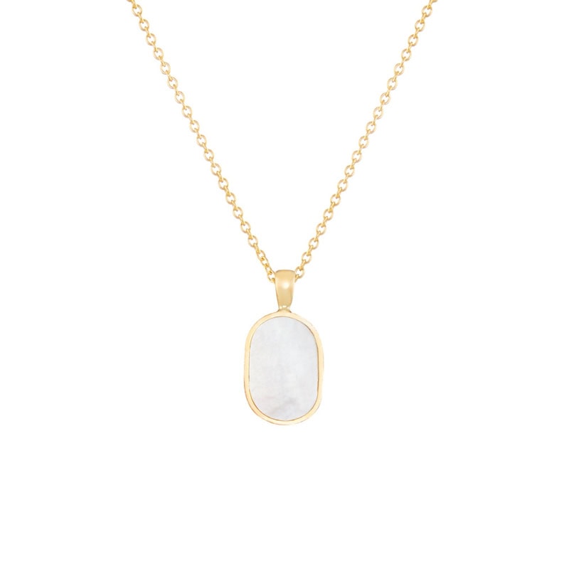 A smooth, oval-shaped mother-of-pearl pendant framed in sterling silver or 9k gold makes this necklace a minimalist yet luxurious choice for admirers of refined beauty.