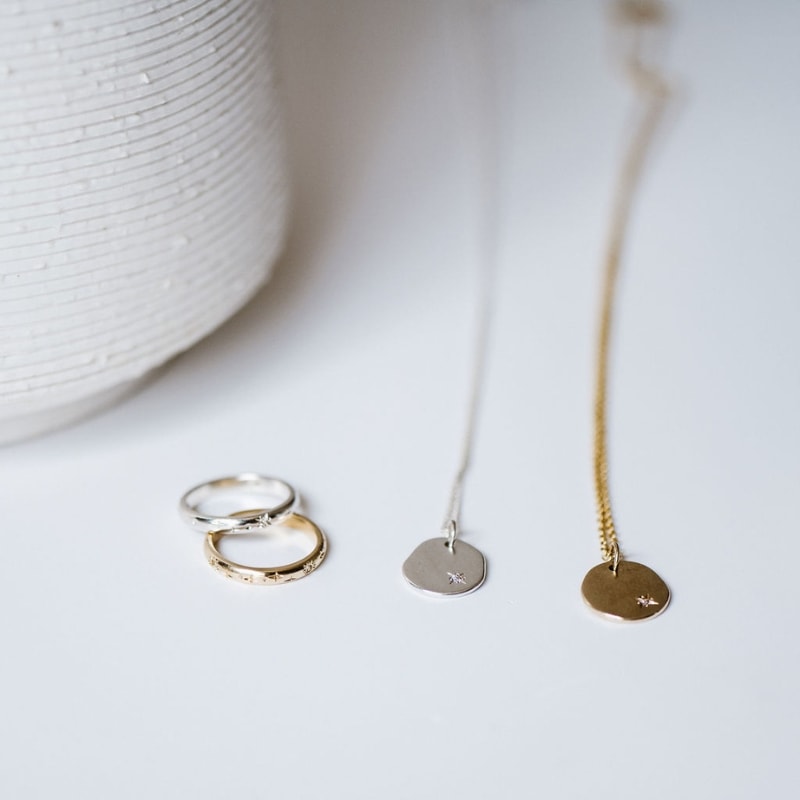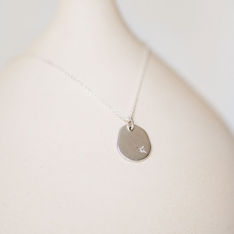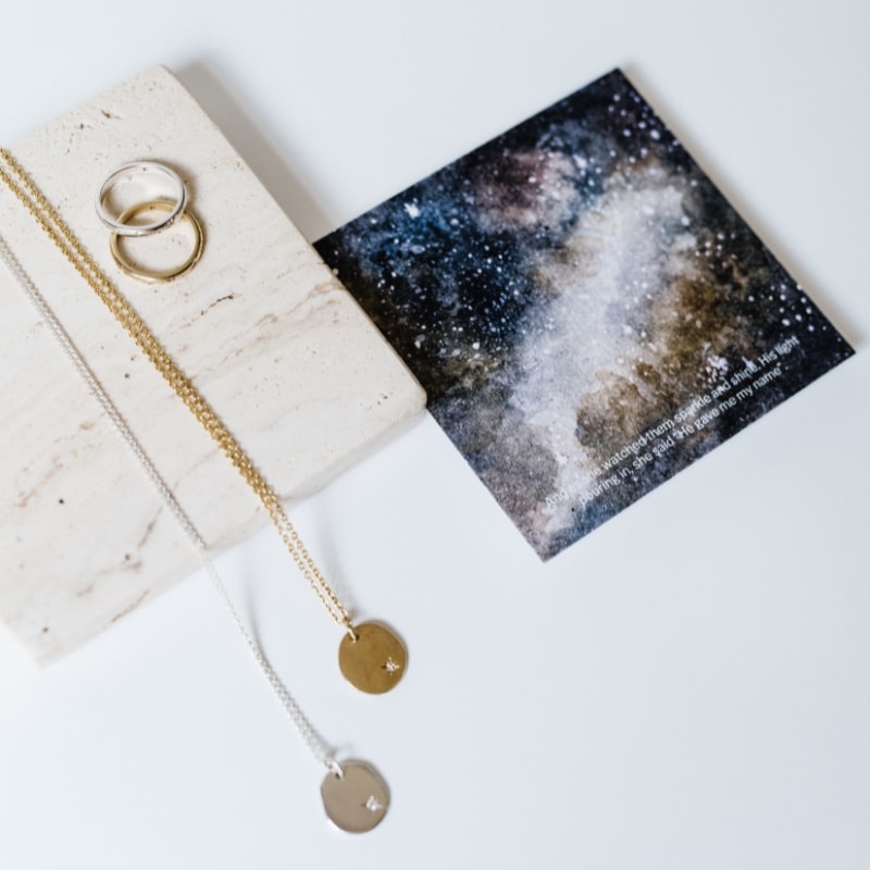 Die Star Necklace bestaan uit ‘n gerolde plaatjie (9k goud of sterling silwer) met ‘n klein diamantjie, geset in die die plaatjie, wat ‘n helder ster in die hemelruim verteenwoordig. So helder soos die ster skyn so seker kan jy weet dat God jou by jou naam ken.