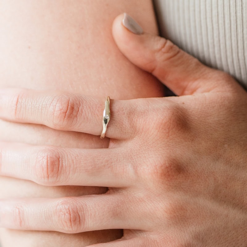 The Steadfast Ring is a delicate piece crafted from 9k gold or sterling silver, featuring a 1.5mm diamond at its centre. The uneven design surrounding the diamond resembles the shape of a rock, with the diamond cradled within, symbolizing how God’s love envelops His children. This stunning diamond serves as a testament to the light you can shine in the world when God is your rock.