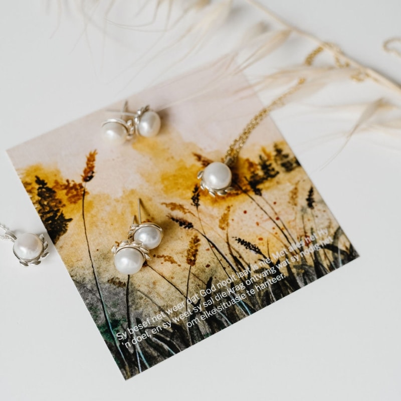 Die Waiting Season Necklace” bestaan uit varswater pêrels en 9k goud of sterling silwer wat in die vorm van ‘n koringaar om die pêrel gerangskik is. Mag die koringare jou altyd herinner daaraan om te vertrou dat God alles op die regte tyd sal laat gebeur.